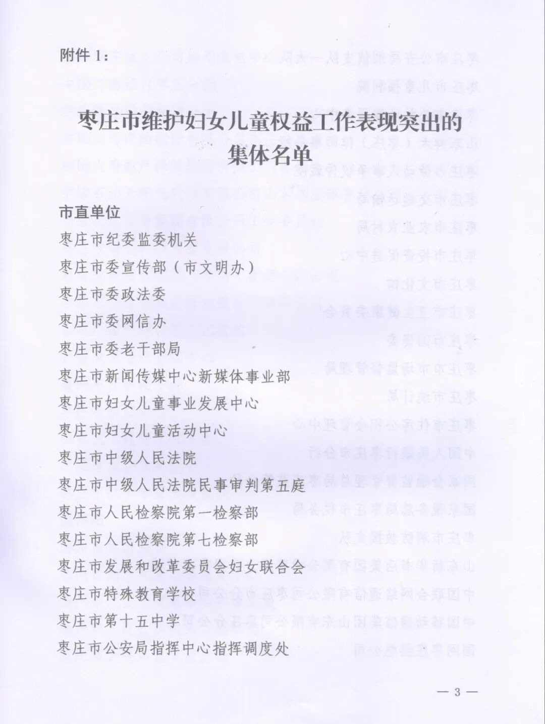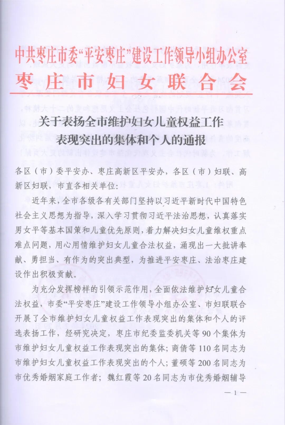 近日,枣庄市委“平安枣庄”建设工作领导小组办公室、市妇联联合开展了全市维护妇女儿童权益工作表现突出的集体和个人的评选表扬工作,经研究决定,通报表扬90个集体为全市维护妇女儿童权益工作表现突出的集体、110名同志为全市维护妇女儿童权益工作表现突出的个人,其中,市中区法院、市中区检察院、市中公安分局指挥中心获评为“全市维护妇女儿童权益工作表现突出的集体”!