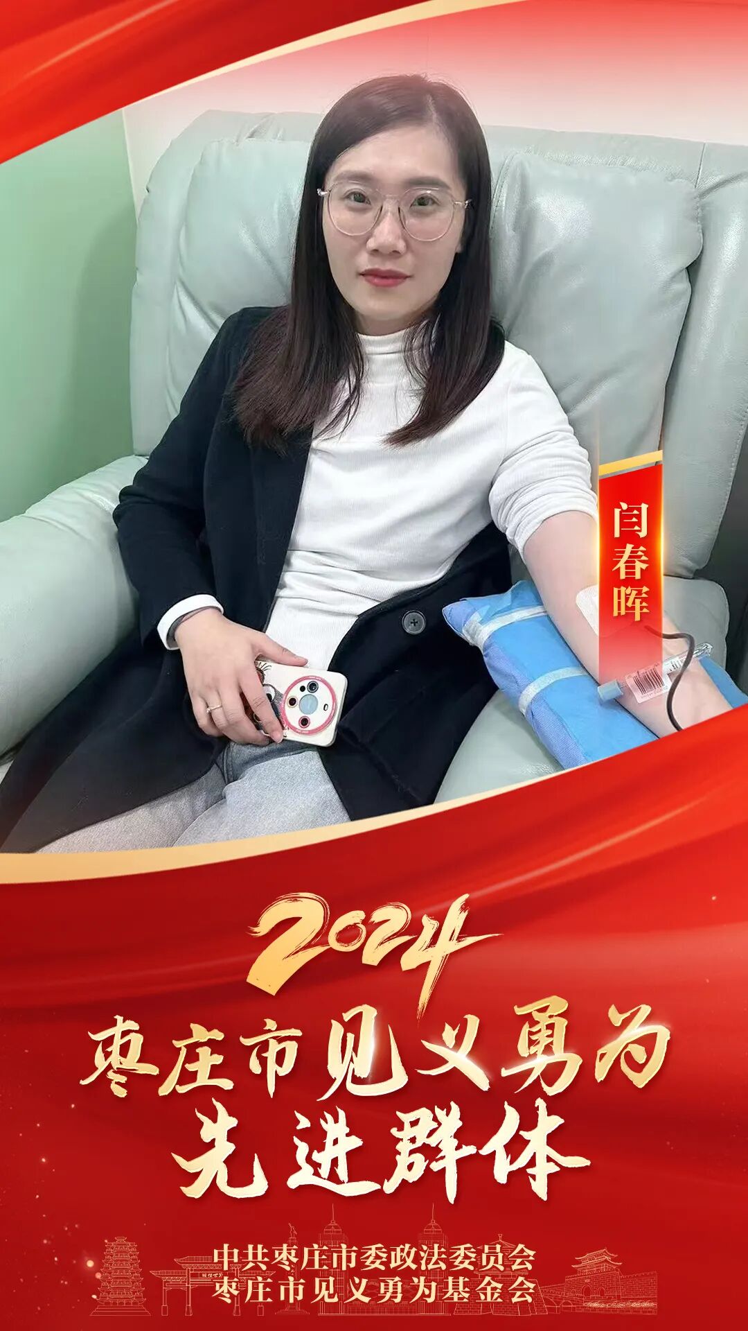 闫春晖,枣庄市第73例造血干细胞捐献者,女,汉族,中共党员,1991年11月生,台儿庄区人民医院产科主治医师,捐献时间:2024年2月5日。