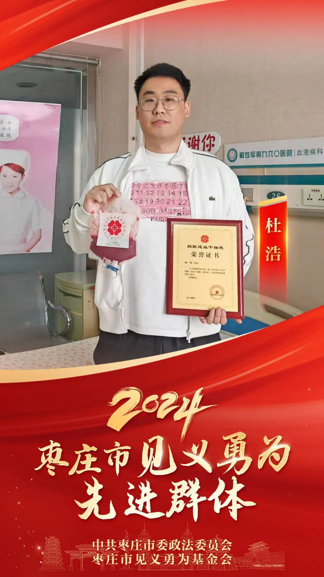 杜浩,枣庄市第82例造血干细胞捐献者,男,汉族,共青团员,1993年9月生,山亭区人民防空事务中心职工,捐献时间:2024年11月12日。