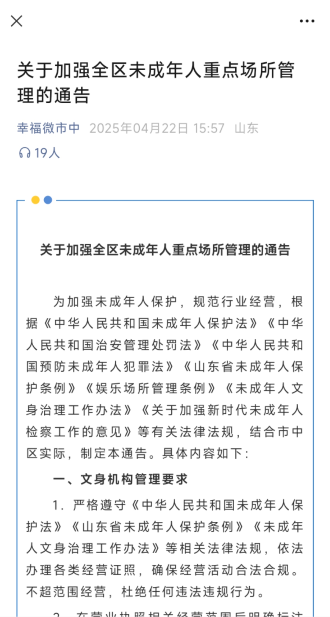 为切实保障未成年人合法权益,为未成年人营造健康安全的成长环境,市中区按照市委政法委安排部署,聚焦文身机构、网约房、台球厅和娱乐场所、酒吧等四个“小切口”场所,全面摸排清查整治,努力营造清朗健康的未成年人成长环境。 早谋划,精细摸排兜底数 今年3月,市中区在全市率先开展重点场所整治研究探索,明确专项治理内容、行业部门职责、联合检查方式以及重点场所摸排等工作,并研究制定《关于加强全区未成年人重点场所管理的通告》。在全市未成年人重点场所专项治理行动推进会议后,区市场监管、文旅、公安等部门迅速行动,对文身机构、网约房等重点场所再次摸底,并将数据推送镇街核查比对,做到底数清、情况明。 重联合,部门协作聚合力 今年以来,区委政法委牵头召开研判会、推进会议4次,统一思想;调配4辆执法车辆,组织8部门配合使用“双随机一公开”平台及“山东通鲁执法”平台开展联合执法。严控文身、烟酒、不良文化产品等对未成年人的侵害,压实经营主体责任,增强未成年人自我保护和法治意识,筑牢未成年人成长安全防线,营造清朗健康的环境空间。 求实效,全面执法促规范 4月24日起,区委政法委牵头,联合区教育和体育局、区文旅局、区卫健局、区市场监管局、区综合执法局、市中公安分局、区烟草专卖局、区消防救援大队等8部门,集中1个月的时间深入各镇街开展重点场所检查。截至目前,已对70余家相关场所进行全面检查,引导经营业主签订《未成年人重点场所经营承诺书》140余份,张贴通告200余张,现场整治问题10余条,确保重点场所经营规范。