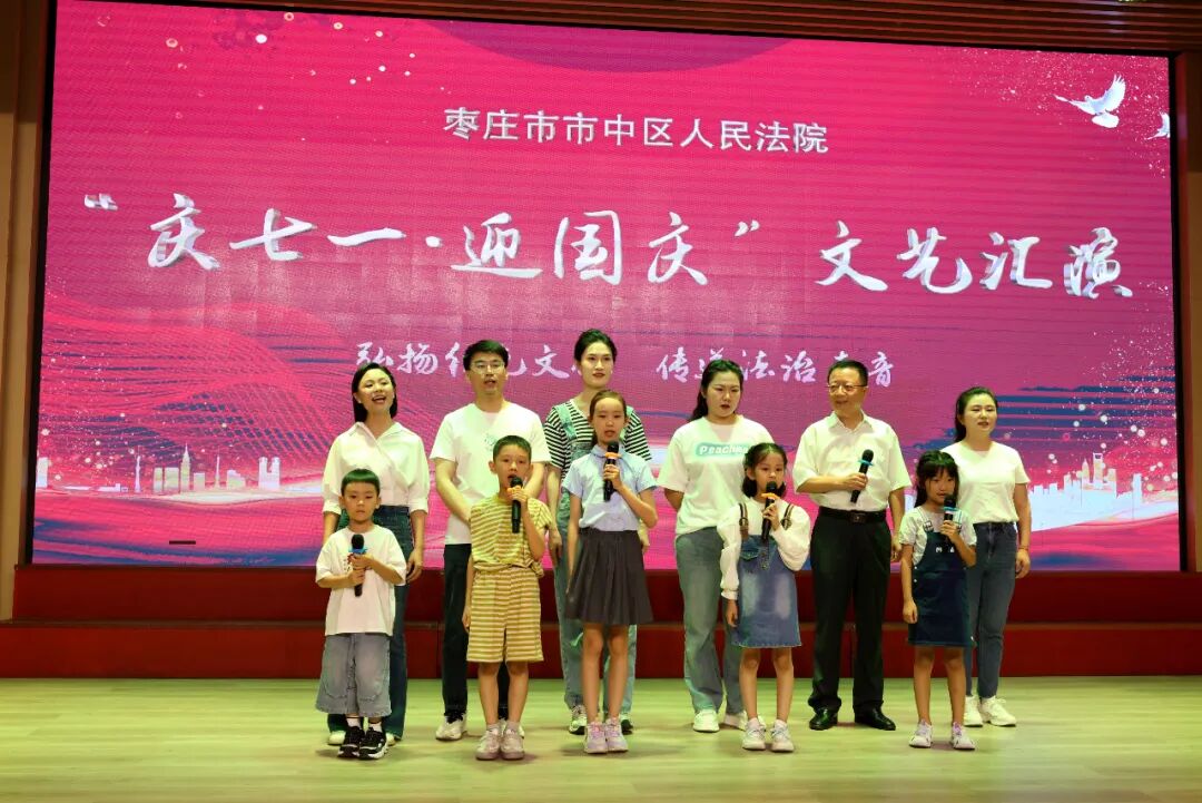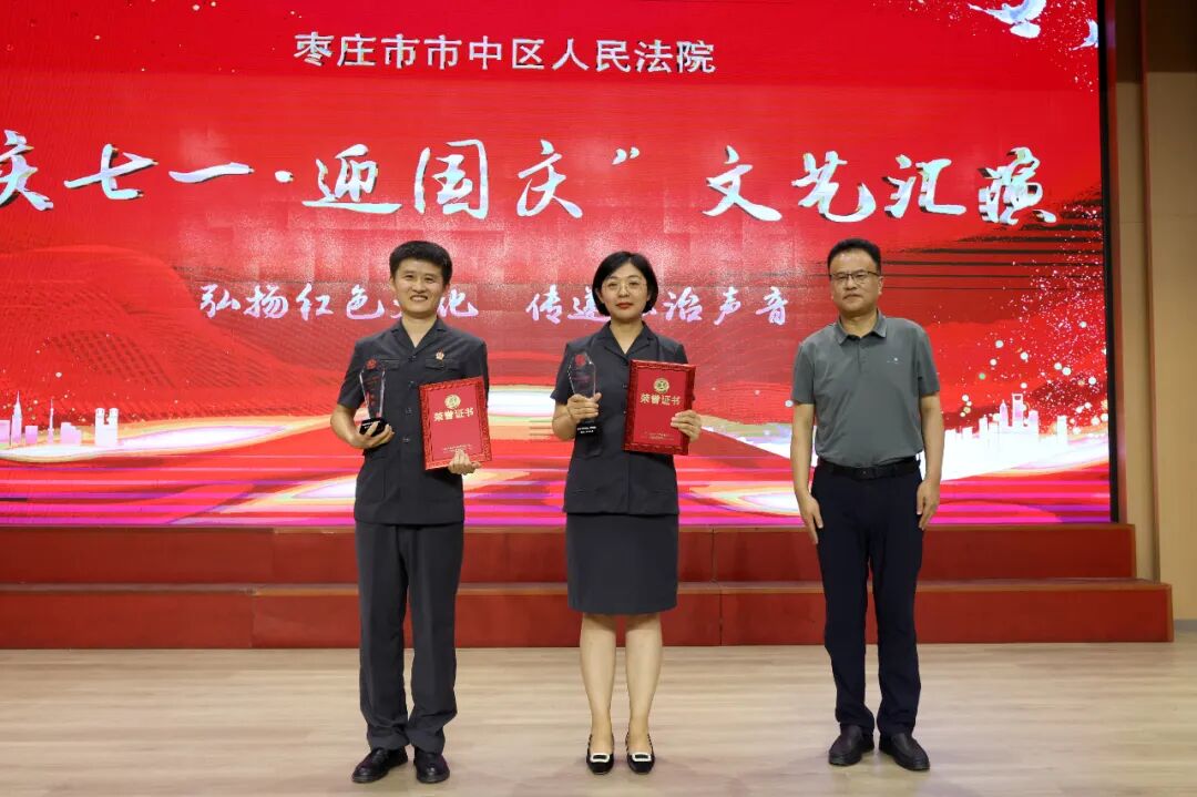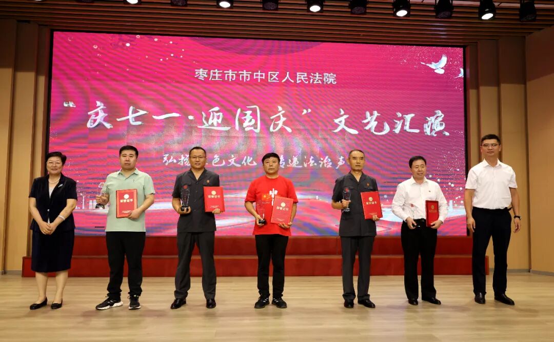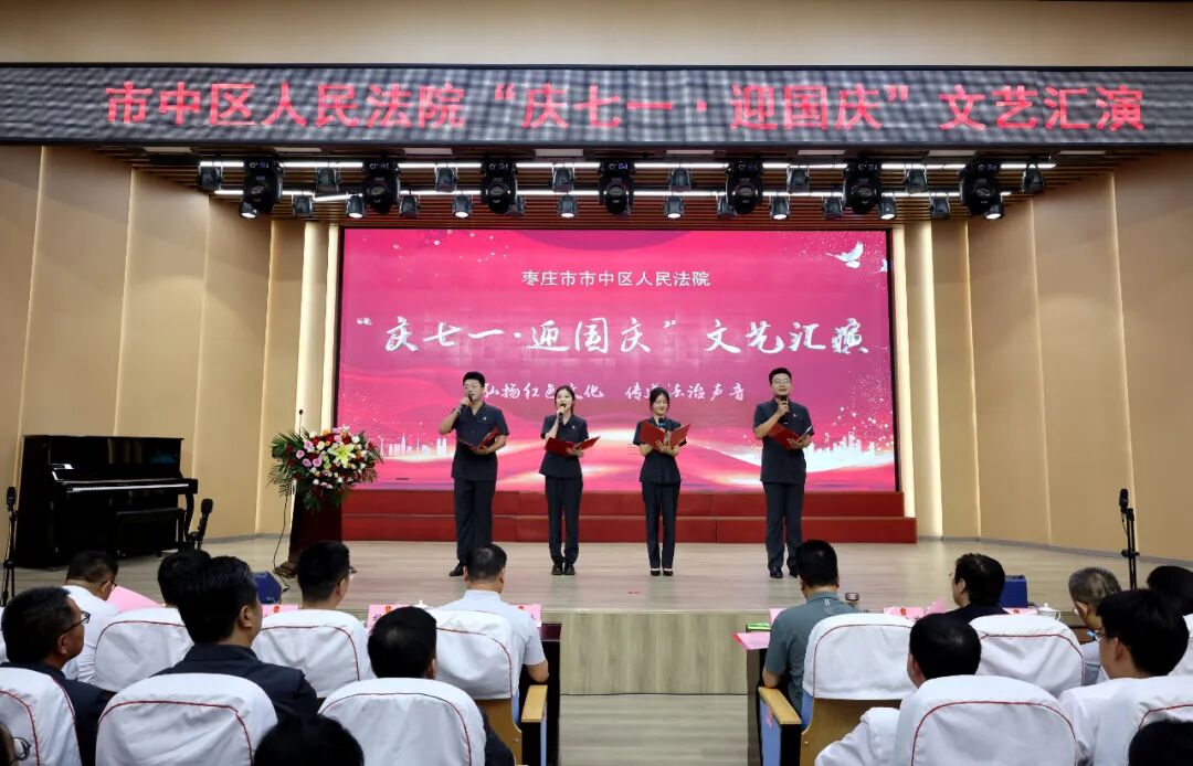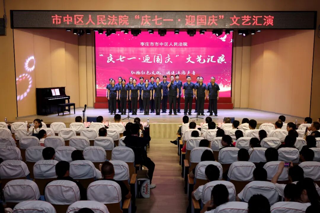 为庆祝中国共产党成立103周年、新中国成立75周年,抒发对党的深厚情感和对祖国的真诚祝福,进一步增强全院干警凝聚力、向心力,7月12日下午,市中区法院“庆七一·迎国庆”文艺汇演活动在鑫昌路小学举行。枣庄中院党组成员、副院长高键,市中区委常委、政法委书记李家法,区人大常委会副主任宋海芳,区政府副区长胡少峰,区政协副主席罗春耕,区委宣传部副部长、区融媒体中心主任王琪,区总工会党组书记、常务副主席孙营昌,鑫昌路小学校长张永远出席活动,区法院全体干警参加活动。 枣庄中院党组成员、副院长高键讲话 区委常委、政法委书记李家法讲话 党组书记、院长马军致辞 舞台时刻 文艺汇演中,独唱、合唱、舞蹈、朗诵、笛子独奏、萨克斯独奏等18个节目逐次登台亮相,干警们用嘹亮的歌声、动人的旋律、深情的话语讴歌祖国日新月异的变化,抒发对党和祖国的无限热爱,赢得了现场观众们阵阵掌声和喝彩。 孟庄法庭、税郭法庭演唱歌曲《国家》 民二庭演唱歌曲《弹起我心爱的土琵琶》 齐村法庭表演《祖国不会忘记》《一路生花》 刑庭演唱歌曲《光阴的故事》 孟庄法庭表演舞蹈《我们都是追梦人》 审管办演唱歌曲《同一首歌》 法警大队朗诵《扬帆领航》 立案庭、技术室演唱歌曲《年轻的朋友来相会》 审判保障中心、综合办公室演唱歌曲《明天会更好》 政治部、工会、督察室表演节目《凝心聚力谋新篇 “政”是扬帆奋进时》 民一庭、知识产权庭演唱歌曲《如愿》 行政庭表演舞蹈《相亲相爱》 法警大队表演《擒敌技术》 执行局、市南法庭演唱歌曲《歌唱祖国》 个人节目 行政庭庭长种法亮笛子独奏《为了谁》 执行局干警甘晴演唱歌曲《阳光路上》 执行局干警杨猛表演萨克斯独奏《如愿》 技术室主任张涛演唱歌曲《毛主席的话儿记心上》 颁奖环节 一等奖 二等奖 三等奖 优秀组织奖 心中有信仰,脚下有力量。文艺汇演落下帷幕,嘹亮的歌声依旧催人奋进,市中区法院将以此次文艺汇演活动为契机,以坚持党的政治建设为统领,以更加昂扬的姿态忠诚履职、担当作为,加快推进审判工作现代化,为谱写中国式现代化市中实践新篇章贡献法院力量。