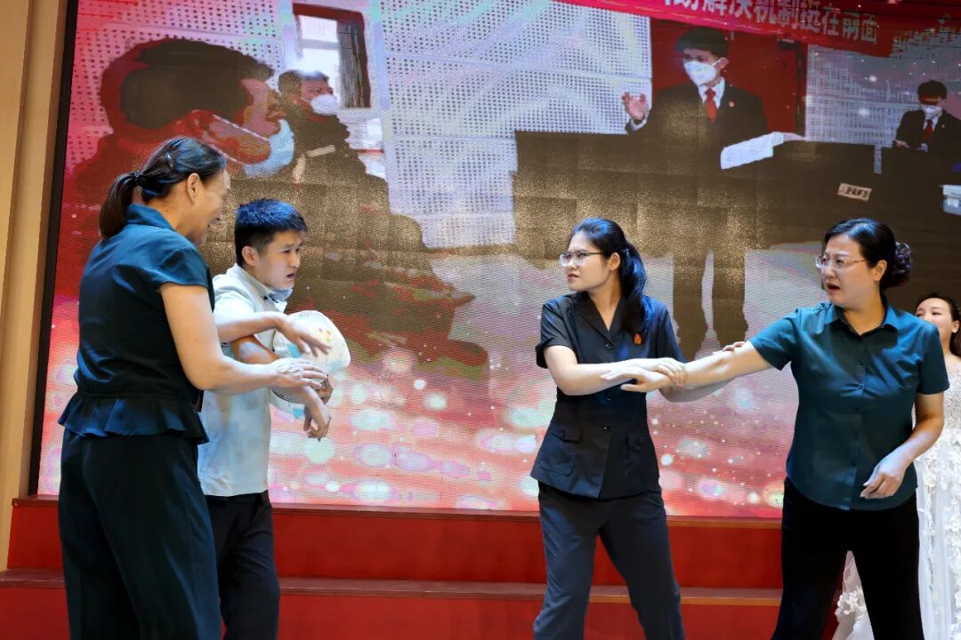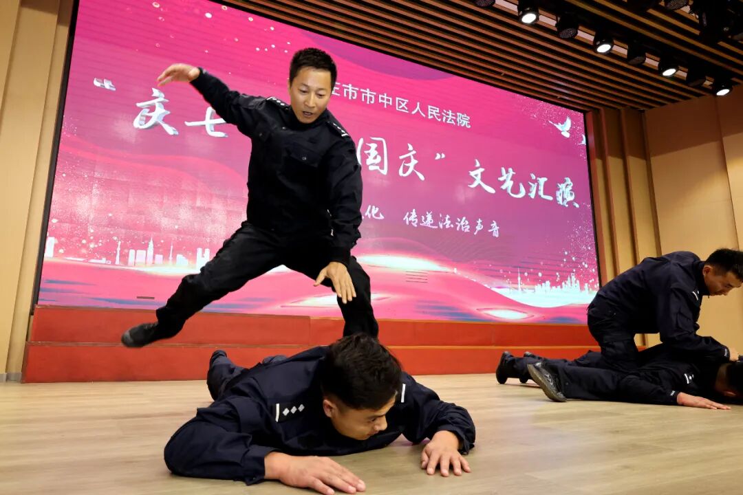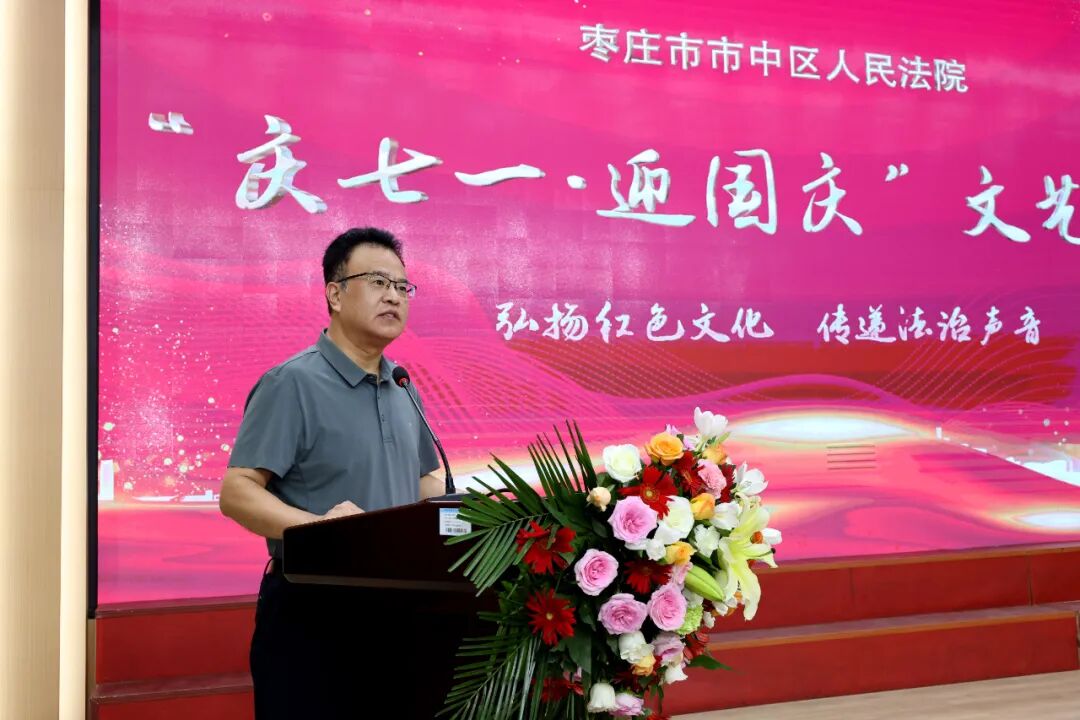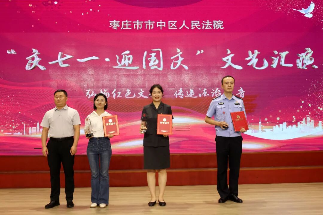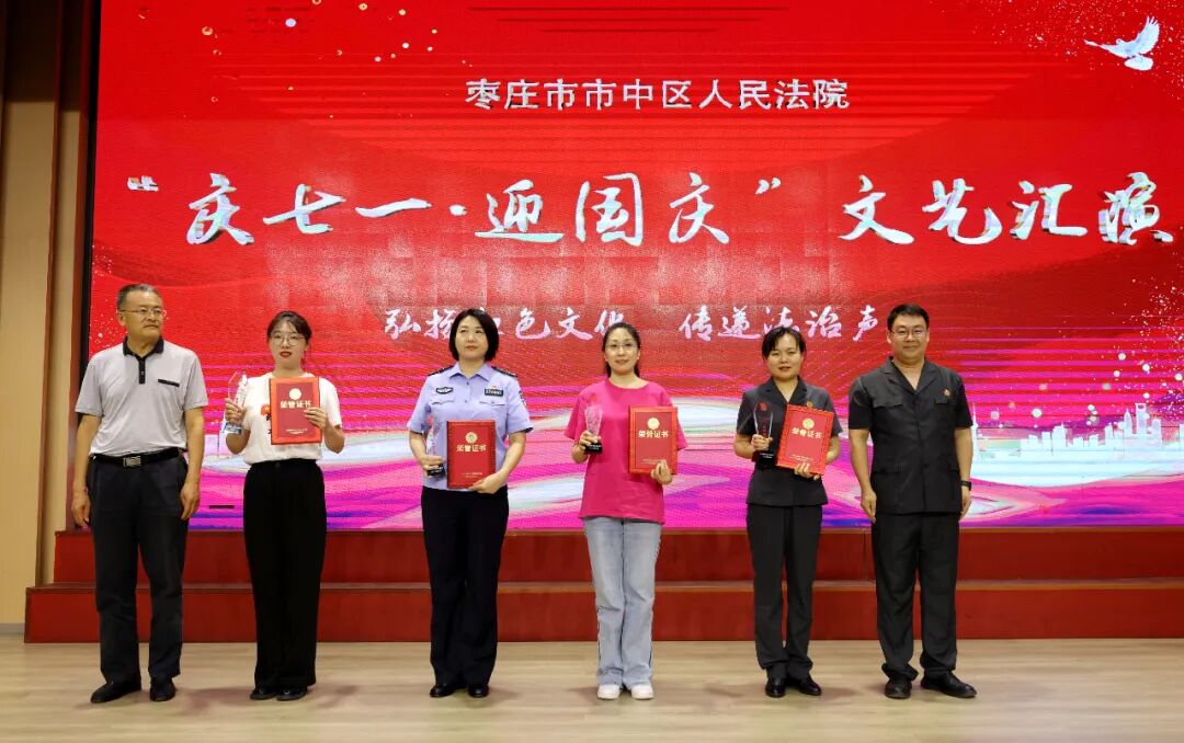 为庆祝中国共产党成立103周年、新中国成立75周年,抒发对党的深厚情感和对祖国的真诚祝福,进一步增强全院干警凝聚力、向心力,7月12日下午,市中区法院“庆七一·迎国庆”文艺汇演活动在鑫昌路小学举行。枣庄中院党组成员、副院长高键,市中区委常委、政法委书记李家法,区人大常委会副主任宋海芳,区政府副区长胡少峰,区政协副主席罗春耕,区委宣传部副部长、区融媒体中心主任王琪,区总工会党组书记、常务副主席孙营昌,鑫昌路小学校长张永远出席活动,区法院全体干警参加活动。 枣庄中院党组成员、副院长高键讲话 区委常委、政法委书记李家法讲话 党组书记、院长马军致辞 舞台时刻 文艺汇演中,独唱、合唱、舞蹈、朗诵、笛子独奏、萨克斯独奏等18个节目逐次登台亮相,干警们用嘹亮的歌声、动人的旋律、深情的话语讴歌祖国日新月异的变化,抒发对党和祖国的无限热爱,赢得了现场观众们阵阵掌声和喝彩。 孟庄法庭、税郭法庭演唱歌曲《国家》 民二庭演唱歌曲《弹起我心爱的土琵琶》 齐村法庭表演《祖国不会忘记》《一路生花》 刑庭演唱歌曲《光阴的故事》 孟庄法庭表演舞蹈《我们都是追梦人》 审管办演唱歌曲《同一首歌》 法警大队朗诵《扬帆领航》 立案庭、技术室演唱歌曲《年轻的朋友来相会》 审判保障中心、综合办公室演唱歌曲《明天会更好》 政治部、工会、督察室表演节目《凝心聚力谋新篇 “政”是扬帆奋进时》 民一庭、知识产权庭演唱歌曲《如愿》 行政庭表演舞蹈《相亲相爱》 法警大队表演《擒敌技术》 执行局、市南法庭演唱歌曲《歌唱祖国》 个人节目 行政庭庭长种法亮笛子独奏《为了谁》 执行局干警甘晴演唱歌曲《阳光路上》 执行局干警杨猛表演萨克斯独奏《如愿》 技术室主任张涛演唱歌曲《毛主席的话儿记心上》 颁奖环节 一等奖 二等奖 三等奖 优秀组织奖 心中有信仰,脚下有力量。文艺汇演落下帷幕,嘹亮的歌声依旧催人奋进,市中区法院将以此次文艺汇演活动为契机,以坚持党的政治建设为统领,以更加昂扬的姿态忠诚履职、担当作为,加快推进审判工作现代化,为谱写中国式现代化市中实践新篇章贡献法院力量。