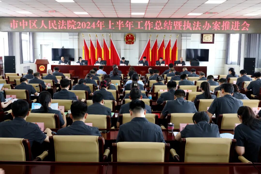 7月10日,市中区法院组织召开2024年上半年工作总结暨执法办案推进会,传达学习上级法院有关会议精神,总结全院上半年工作,查摆问题和不足,并对下半年工作进行部署。党组书记、院长马军出席会议并讲话,党组成员、三级高级法官王家利主持会议。 会上,党组成员、三级高级法官秦丽传达了全市法院第二季度审判运行态势分析暨执法办案工作推进会精神。党组成员、副院长付杰通报了2024年上半年全院及各业务部门审判执行质效情况。各业务庭室负责人重点汇报了本庭室上半年的主要工作情况,实事求是地剖析当前存在的问题和不足,并明确了下半年的工作目标。党组书记、院长马军对市中区法院上半年工作情况进行了全面总结和回顾,并对下半年各项工作提出要求。 会议强调,全院上下要坚持以习近平新时代中国特色社会主义思想为指导,聚焦“公正与效率”工作主题,深入实施政治引领、司法护航、质效齐升、卓越品牌、强基赋能“五项工程”,坚持问题导向,进一步强化措施,狠抓落实,确保高质量完成全年目标任务。要突出党建引领,坚持抓党建带队建促审判,持续加强党建品牌建设,规范落实重大事项请示报告工作,确保法院工作正确政治方向。要践行能动司法,深化诉前调解中心建设,建立健全府院联动机制,抓实司法建议工作,强化信访维稳,做深做实为大局服务。要锚定提质增效,强化审判监督管理,全面落实院庭长案件阅核、发改案件评析、差异化考核等机制,压实辅助办案责任,切实提升审判质效。要全面从严管党治院,抓实党纪学习教育,常态化开展“法官讲堂”“岗位练兵”活动,一体融合推进干警政治素质、业务素质、职业道德素质建设,锻造堪当现代化建设重任的法院铁军。 班子成员、执行局局长、各业务部门主要负责人、各党支部书记、执行局各团队长、全体员额法官、法官助理参加会议。