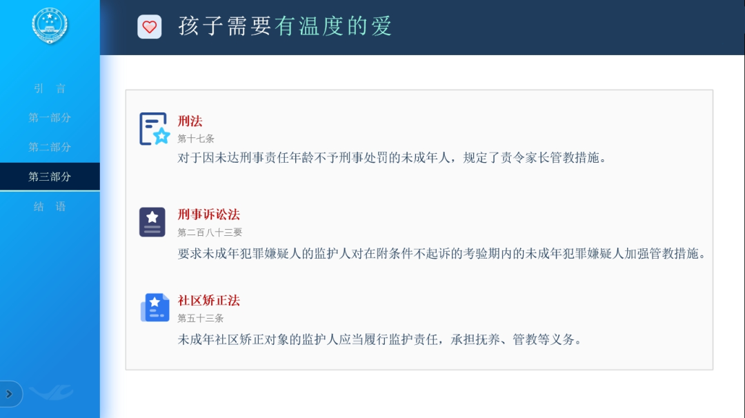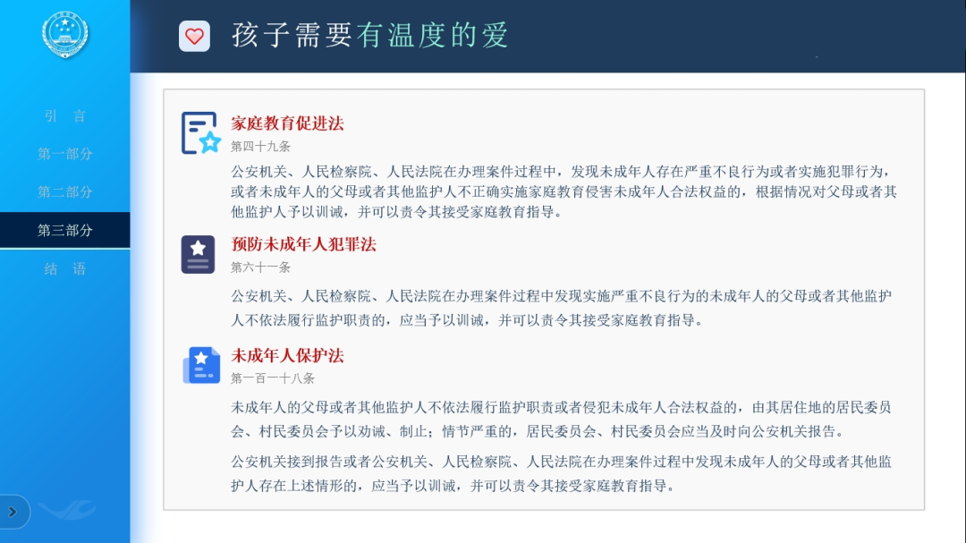 为帮助家长树立正确的家庭教育观念,加强亲子间有效沟通,促进涉罪未成年人健康成长,2024年1月23日,枣庄市市中区人民检察院未成年人检察工作办公室检察官以“让法律护航家庭教育”为主题,围绕未成年人犯罪现状、父母的责任、如何依法开展家庭教育等三部分内容,为30余名涉案未成年人家长开展一堂家庭教育法治宣讲。 课上,检察官介绍了未成年人犯罪的特点,并通过案例回顾、播放视频等多种形式,从法律的角度让家长们更深入了解家庭教育责任,同时结合《家庭教育促进法》中所规定的家长责任,引导家长如何给孩子有尊严、有规矩、有温度的爱,及时发现、纠正孩子的不良行为,帮助孩子茁壮成长。 课后,未成年人检察工作办公室成员联合心理咨询师、家庭指导师与家长们进行深入交流,帮助家长走进孩子的世界看问题。家长们纷纷表示通过参加此次家庭教育法治讲座受益匪浅,更加认识到了家庭教育的重要性,今后要多尊重、鼓励孩子,用科学的家庭教育陪伴孩子健康成长。 本次家长课堂是2024年市中区检察院对涉案未成年人家长开展的第一期家庭教育指导,也是督促涉案未成年人父母提升监护能力、落实监护责任的有益探索和成功实践。下一步,市中区检察院“中兴未检”团队将以《家庭教育促进法》为基础,联合学校、教育行政部门、妇女联合会等部门,推动构建“家庭教育+未成年人帮教”体系,全方位护航未成年人健康成长。 检察官寄语: “天下之本在家。”家庭是未成年人的“第一所学校”,父母是未成年人的“第一任老师”。家庭教育既是教育孩子的起点和基点,也是造就孩子成才的必要条件。以往“散养式”“打骂式”等错误养娃法应当及时摒弃。家长仅履行抚养义务远远不够,更需要注重家庭建设,扛起教育和陪伴的责任,形成良好的养育观念,掌握合适的教育方法,帮助孩子树立正确的人生观和价值观,培养其良好的道德品质,助力未成年人健康成长。 来源:市中区人民检察院