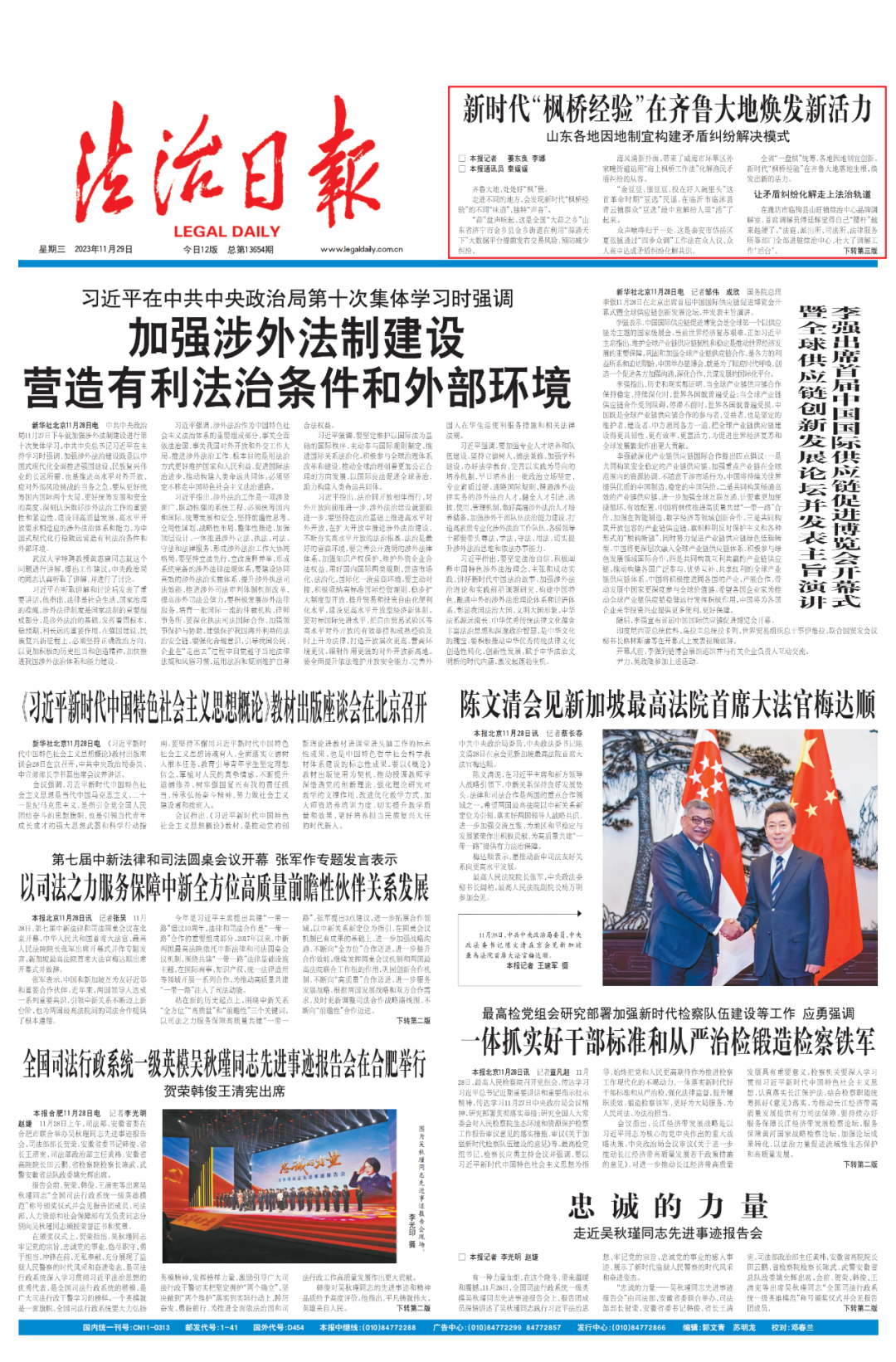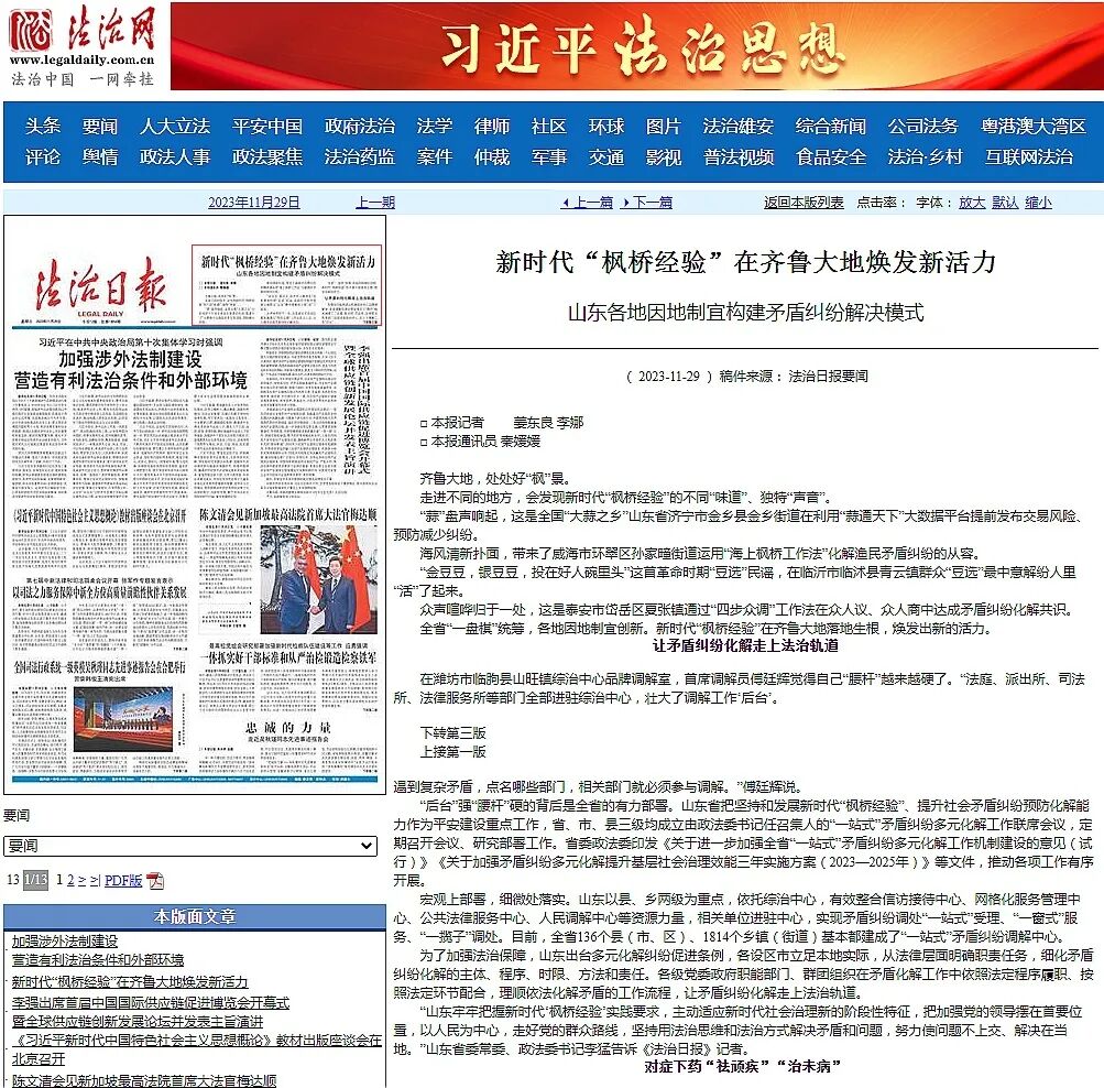 11月29日,《法治日报》头版转第三版刊发《新时代“枫桥经验”在齐鲁大地焕发新活力 山东各地因地制宜构建矛盾纠纷解决模式》走进不同的地方,会发现新时代“枫桥经验”的不同“味道”、独特“声音”。“蒜”盘声响起,这是全国“大蒜之乡”山东省济宁市金乡县金乡街道在利用“蒜通天下”大数据平台提前发布交易风险、预防减少纠纷。海风清新扑面,带来了威海市环翠区孙家疃街道运用“海上枫桥工作法”化解渔民矛盾纠纷的从容。“金豆豆,银豆豆,投在好人碗里头”这首革命时期“豆选”民谣,在临沂市临沭县青云镇群众“豆选”最中意解纷人里“活”了起来。众声喧哗归于一处,这是泰安市岱岳区夏张镇通过“四步众调”工作法在众人议、众人商中达成矛盾纠纷化解共识。