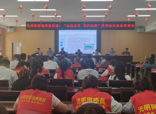 为营造辖区全民反诈的浓厚氛围,提升广大群众的反诈意识和识骗防骗能力,有效遏制电信网络诈骗及其关联犯罪案件的发生,7月23日下午,光明路街道综治中心联合光明路派出所,特别举办了一场“全民反诈 守护光明”反诈知识宣传培训会。